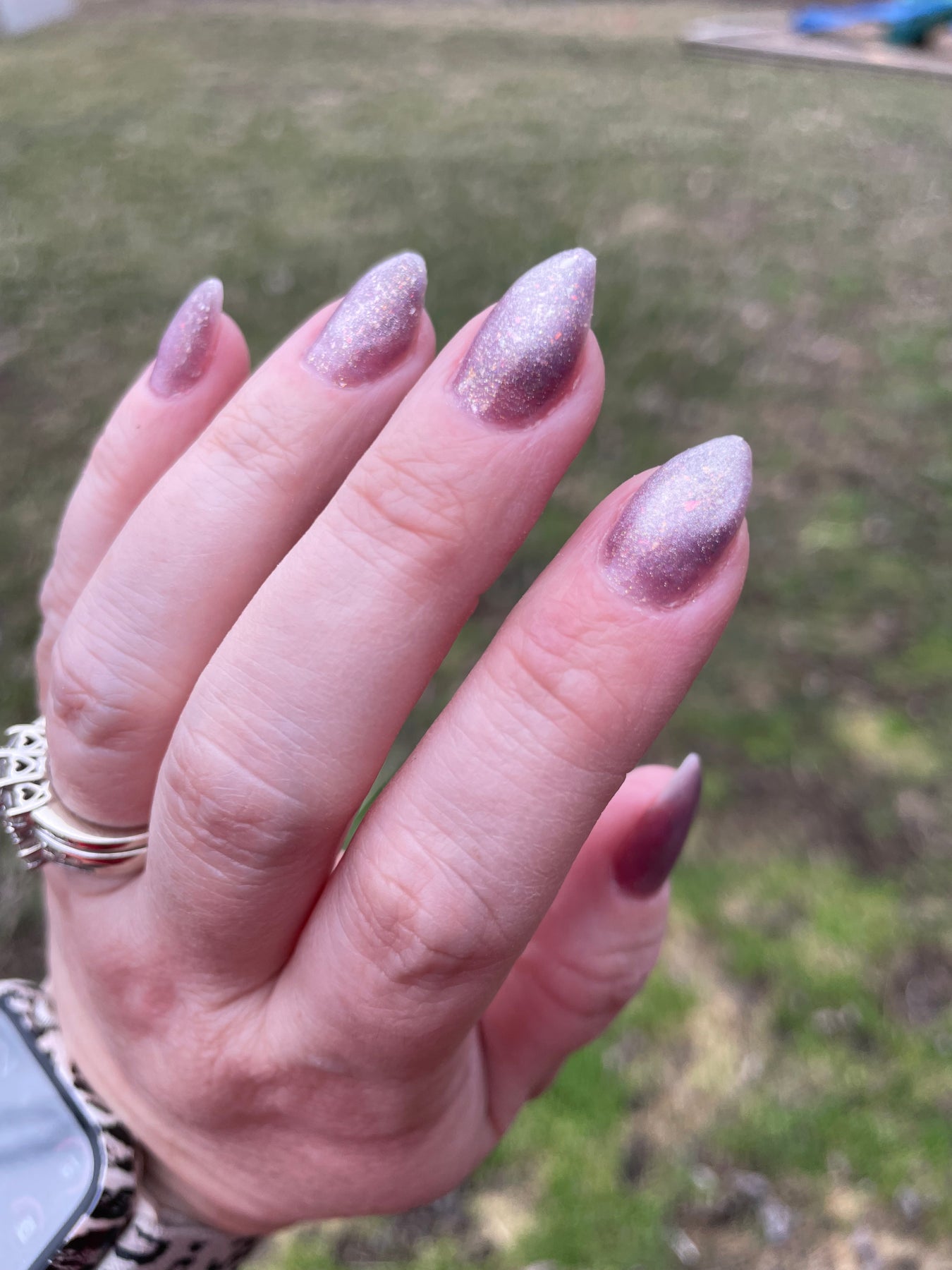 A silvery foil gel with a fiery gray-purple base—flashy, edgy, and completely unapologetic. Zero chill, all attitude. 🔥