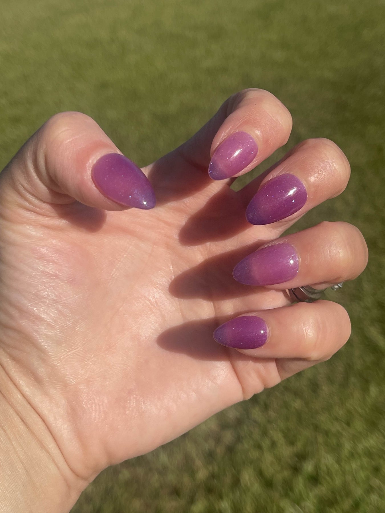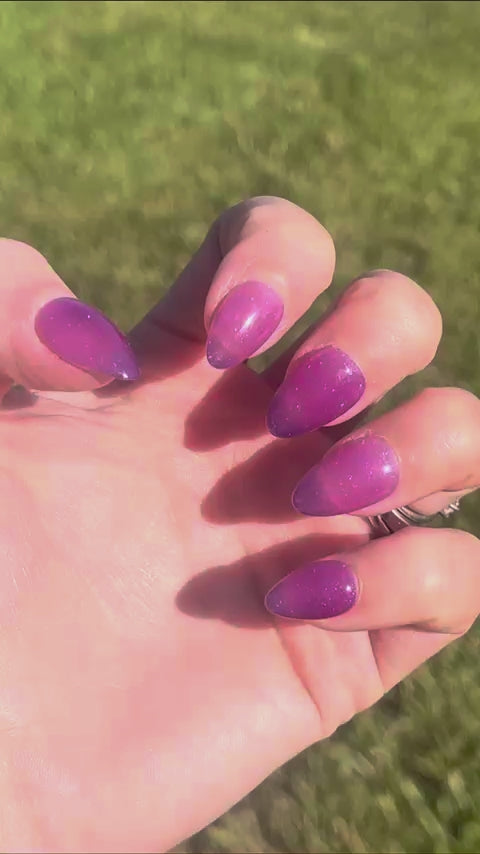 A mesmerizing blue-to-purple temperature changer with a soft shimmer that shifts like twilight on a frosty evening.