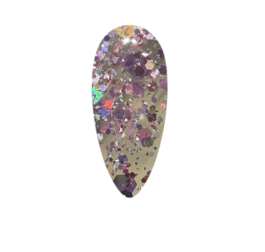 A crystal-clear base bursting with holographic pink-purple glitter. 💖🌌 Fun, flirty, and full of sparkle