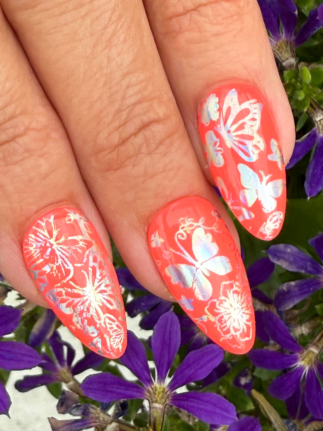 - Place the foil transfer and press it firmly all around. (Using a tool like the rubber back of the Peppi Gel tweezers works great.)